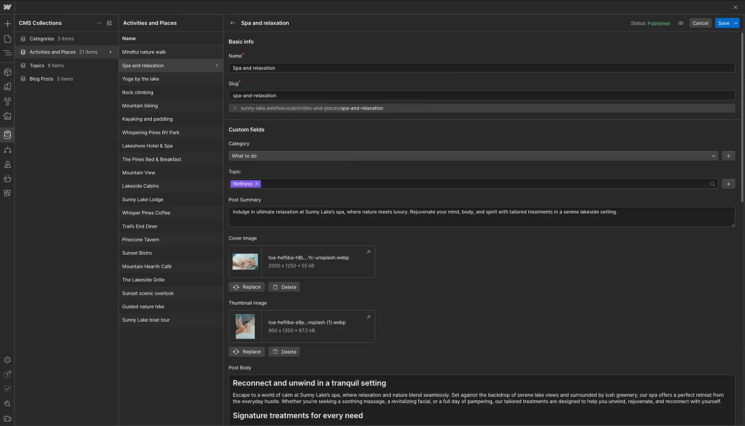 The Sunny Lake template is powered by Webflow's CMS, making it simple to manage your site’s content. Most of the pages, such as What to do, Where to stay, and Where to eat, are connected to the CMS collection titled Places and Activities.